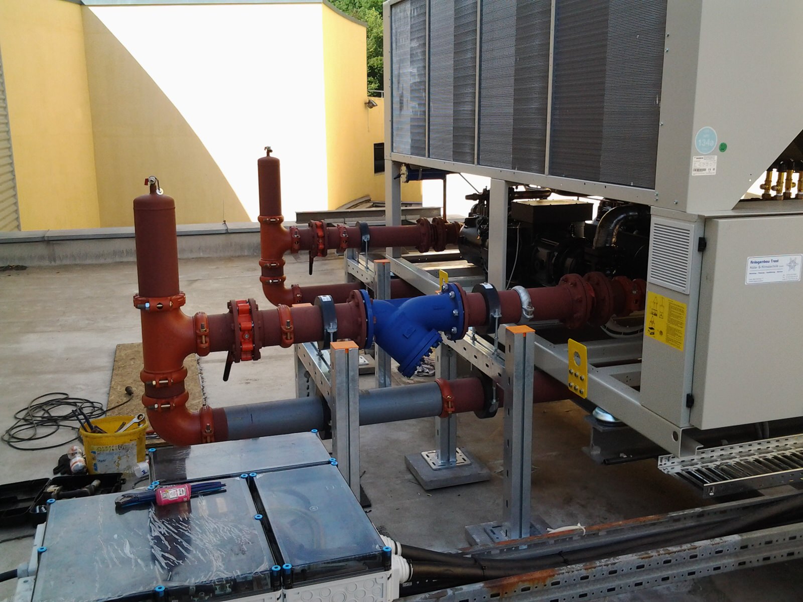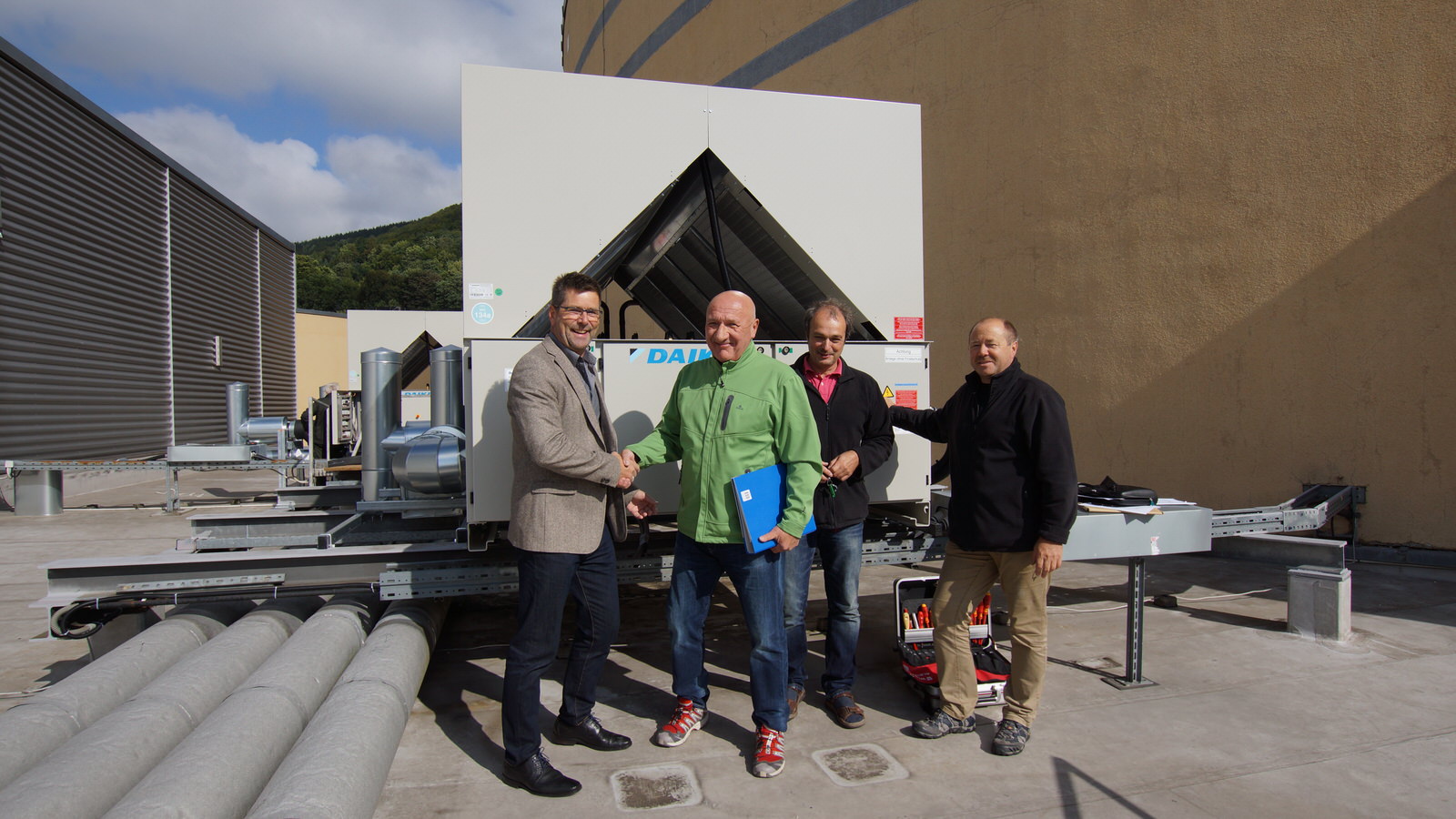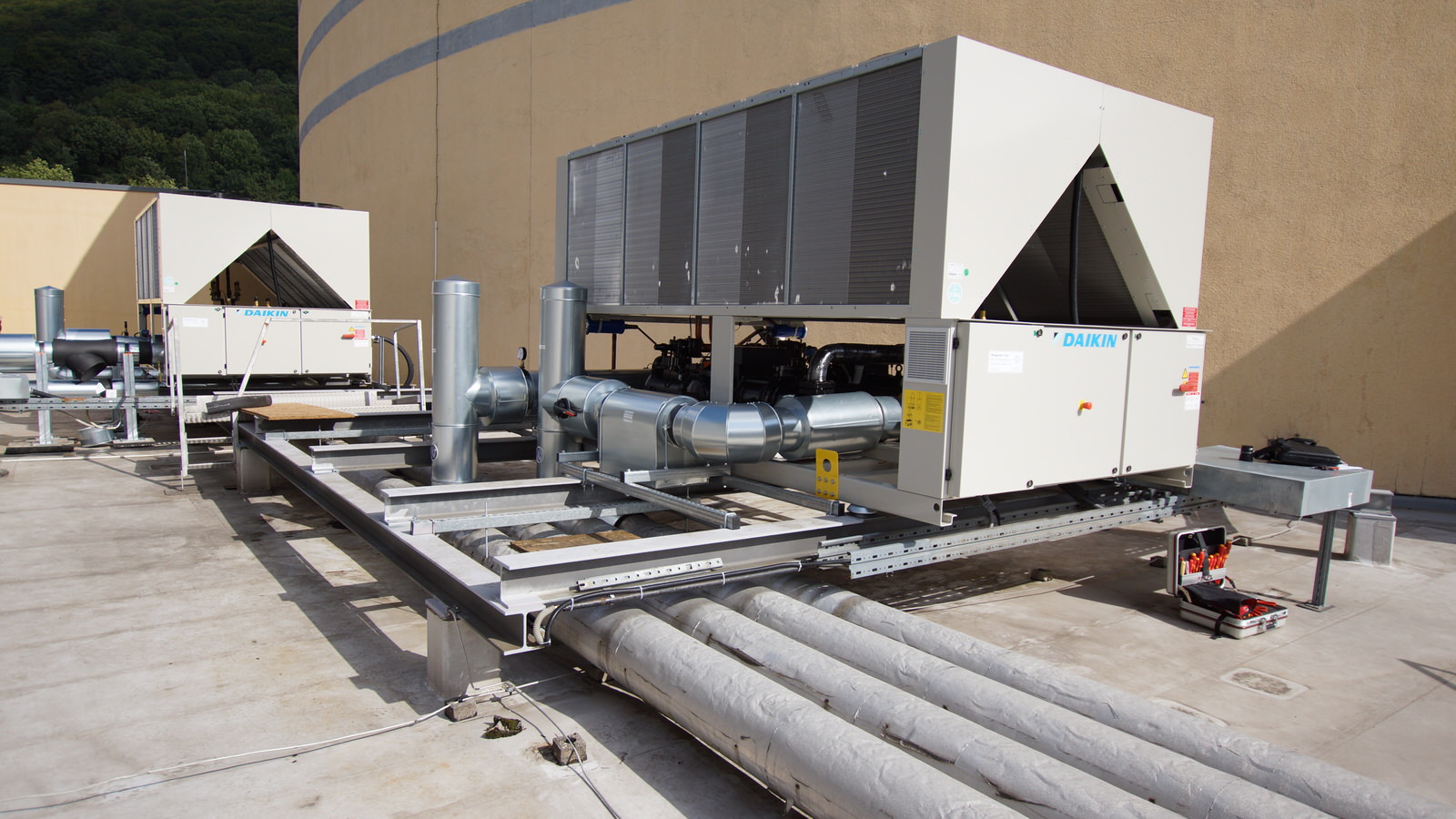 Zum Einsatz kamen DAIKIN Kaltwasser-Schraubenanlagen mit einer Kälteleistung von 1.200 kW Zukunftssicheres und energetisch sinnvolles Kältemittel R134a, dies mit gleichzeitiger Optimierung der Pumpenverteilerstation.